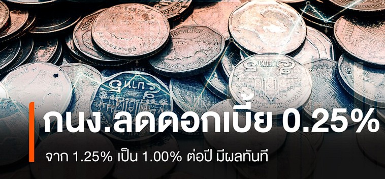 คณะกรรมการนโยบายการเงิน (กนง.) ได้มีมติปรับลดอัตราดอกเบี้ยนโยบายลง 0.25% ส่งผลให้อัตราดอกเบี้ยใหม่ลดลงมาอยู่ที่ระดับ 1.00% ต่อปี การปรับเปลี่ยนครั้งสำคัญนี้มีเป้าหมายเพื่อเป็นกลไกในการกระตุ้นเศรษฐกิจของประเทศไทย